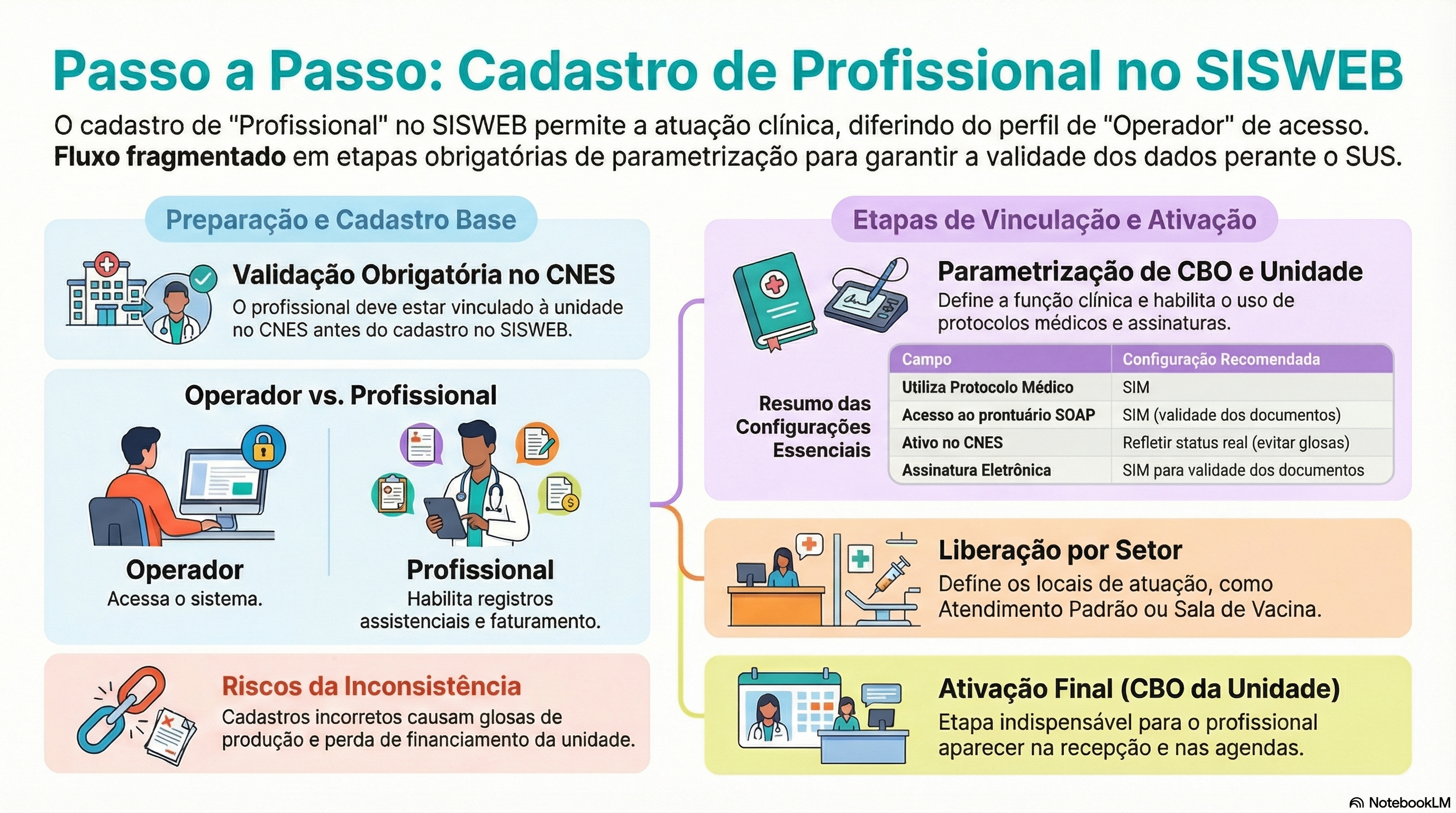 Importante: Caso o profissional não apareça para atendimento, é necessário revisar as etapas de vinculação, especialmente o CBO da unidade, que é responsável pela liberação final no sistema.