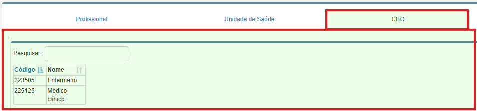 - CBO: apresenta os CBOs cadastrados para o profissional