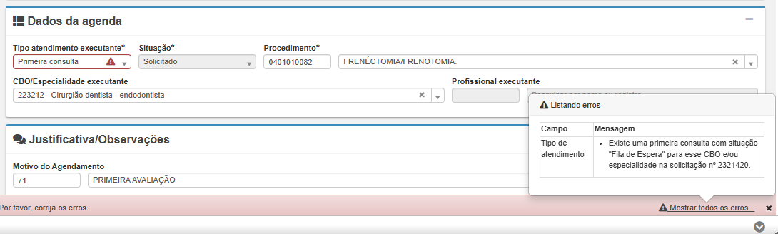 Na versão v25.02.13 e anteriores, apenas o campo de justificativa é obrigatório no sistema. No entanto, recomenda-se preencher também, pelo menos, o campo de motivo do agendamento e o CID. Esse preenchimento completo contribui para maior agilidade no processo, evitando que a solicitação seja devolvida com pendências pela equipe da Central de Regulação, o que pode atrasar o atendimento ao paciente. Para melhorar esse fluxo, será aberto um chamado solicitando a customização deste módulo no sistema, tornando esses campos obrigatórios.