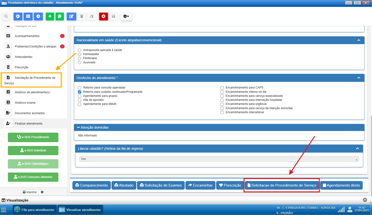 No rodapé da página: Ao finalizar o atendimento SOAP, role a página até o rodapé e procure pelo botão de "Solicitar Serviço" ou "Guia de Encaminhamento".