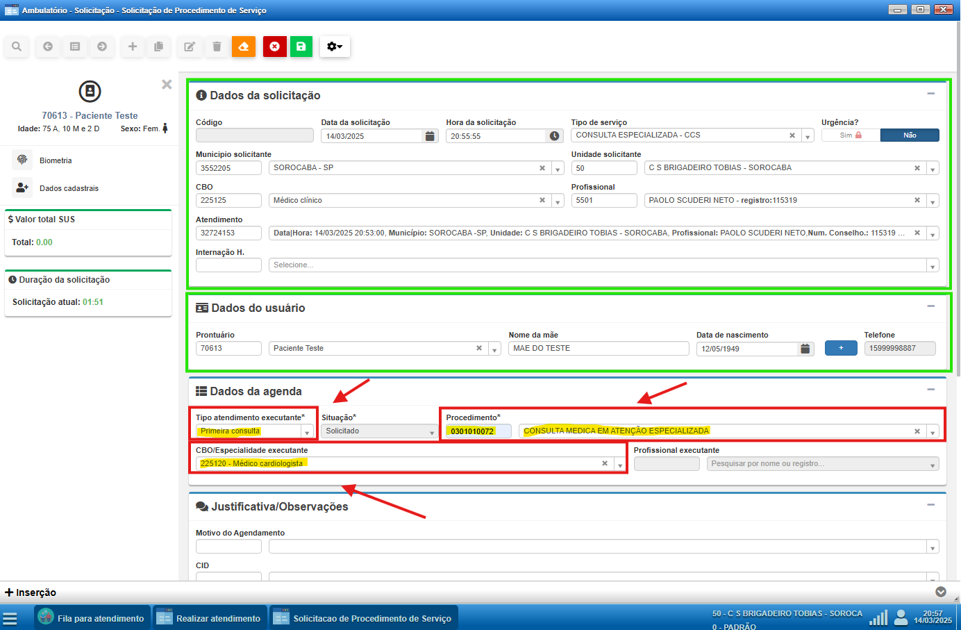 Note que a tela de solicitação de procedimento de serviço já virá préviamente preenchida com as informações do atendimento e do paciente. Isso acontece porque a solicitação está diretamente vinculada ao atendimento SOAP realizado, garantindo consistência e agilidade no processo.