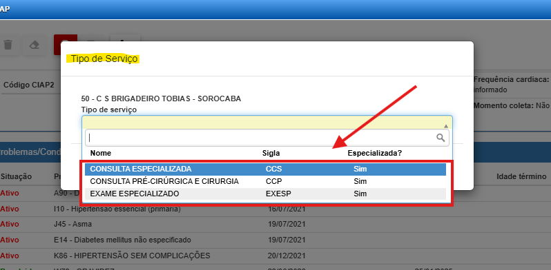 Clicando no botão de Solicitação de Procedimento de Serviço, um pop-up aparecerá na sua tela para que você informe qual o tipo de serviço a qual estará encaminhando o paciente.