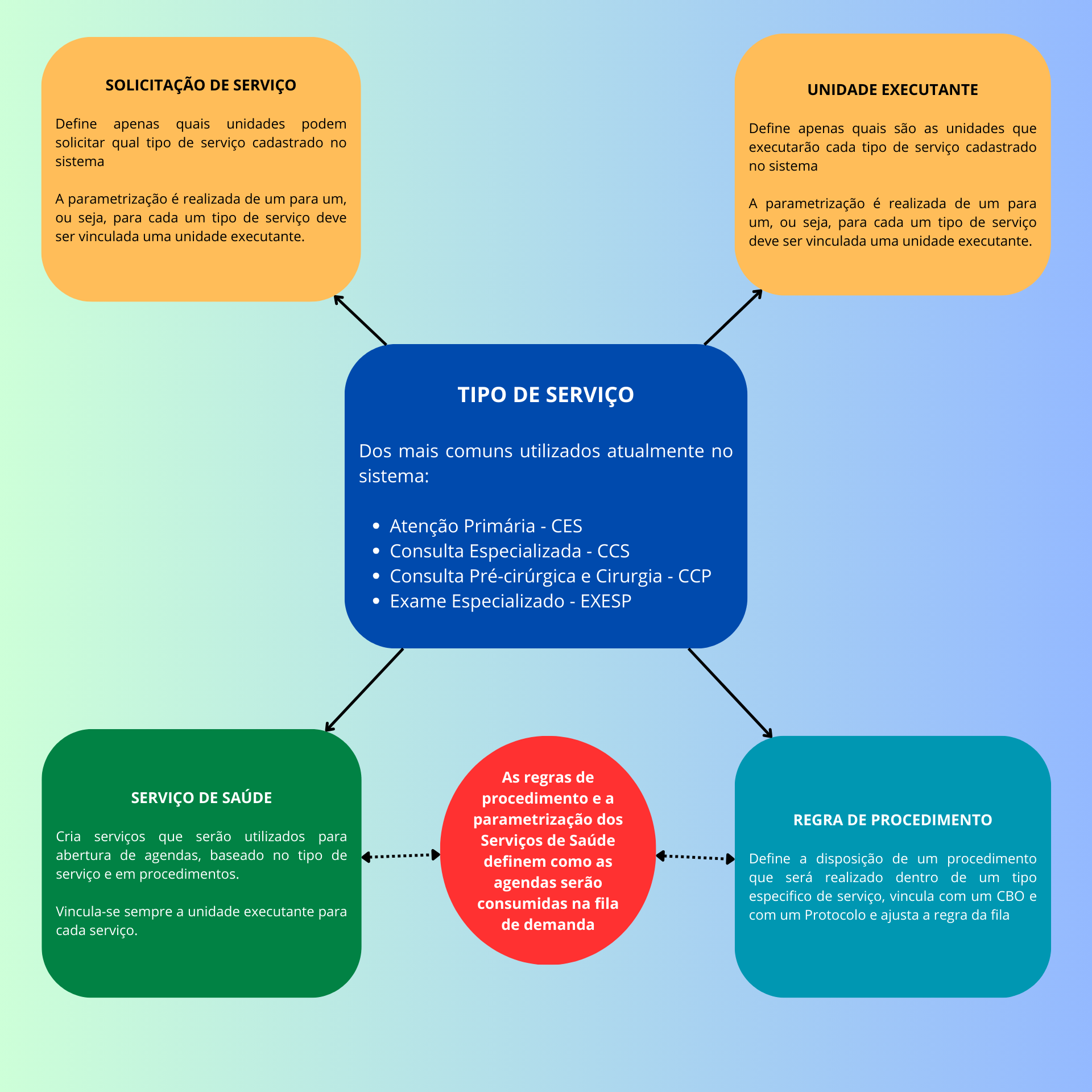 O processo se inicia com a definição do Tipo de Serviço, passando pela configuração das unidades solicitantes e executantes, até chegar na criação de regras de procedimentos e na disponibilização dos serviços para que as unidades possam criar suas agendas.