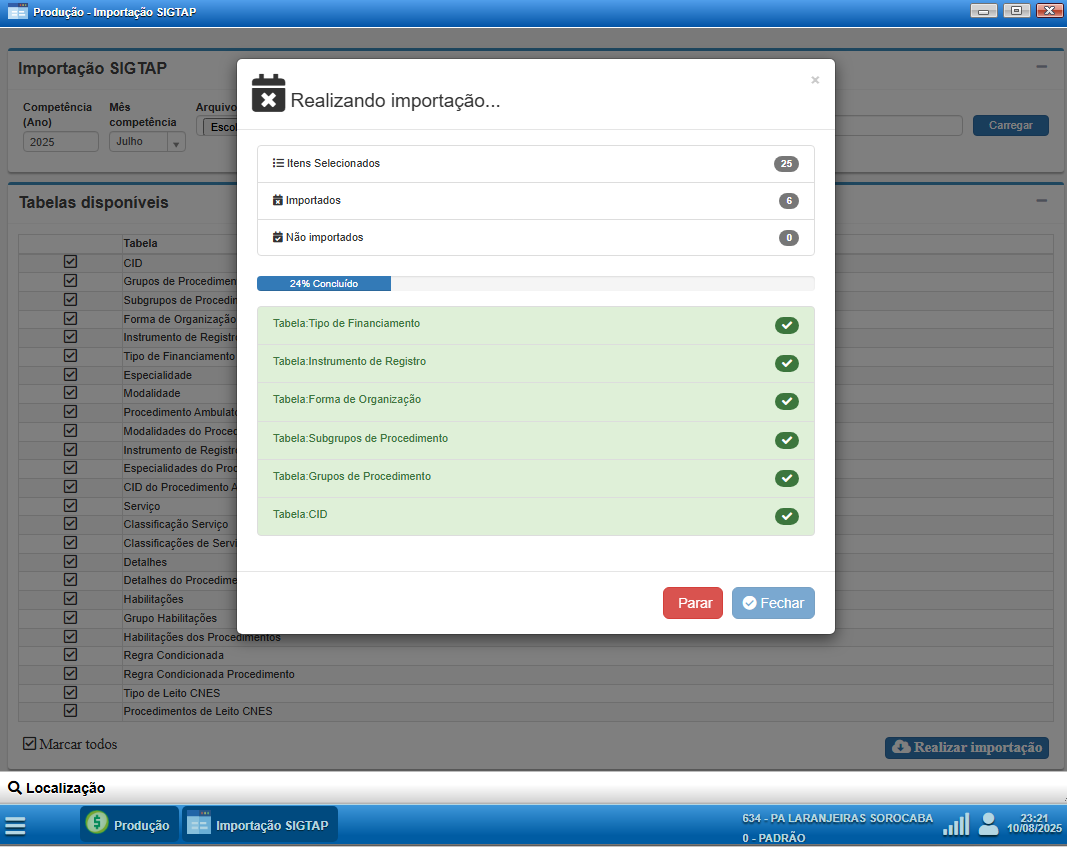 Assim que a importação for concluída, feche a janela para prosseguir com as demais etapas. Nesse momento, o SIGTAP já estará atualizado com sucesso.