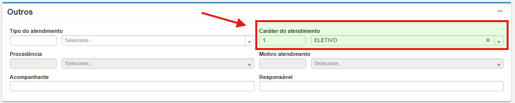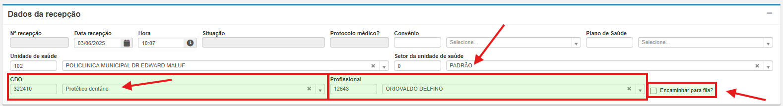 Após localizar o paciente, preencha os campos obrigatórios no bloco Dados da Recepção:
