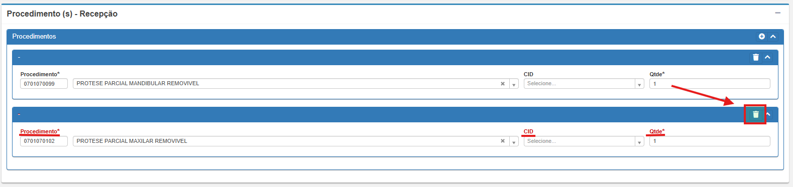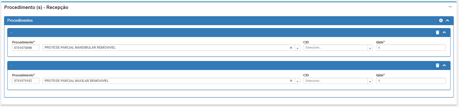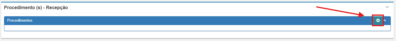 No bloco Procedimento(s) - Recepção, clique no botão "+" (Adicionar Procedimento) para cada prótese que será registrada.