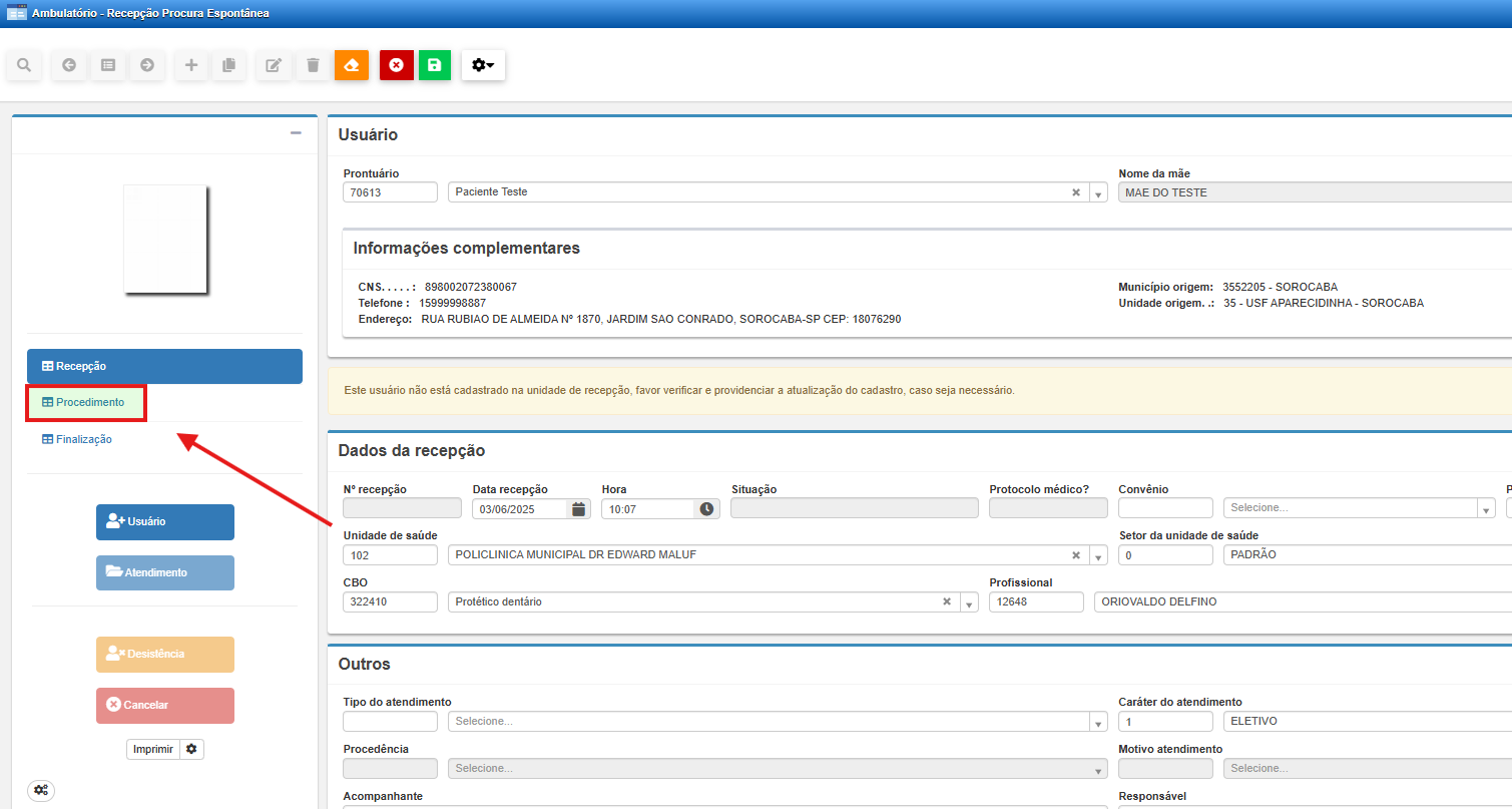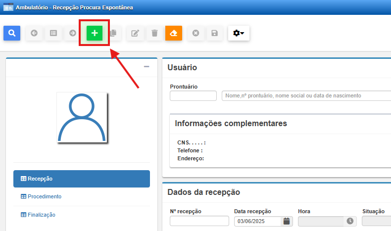 O registro deverá ser realizado na tela Recepção procura espontânea.