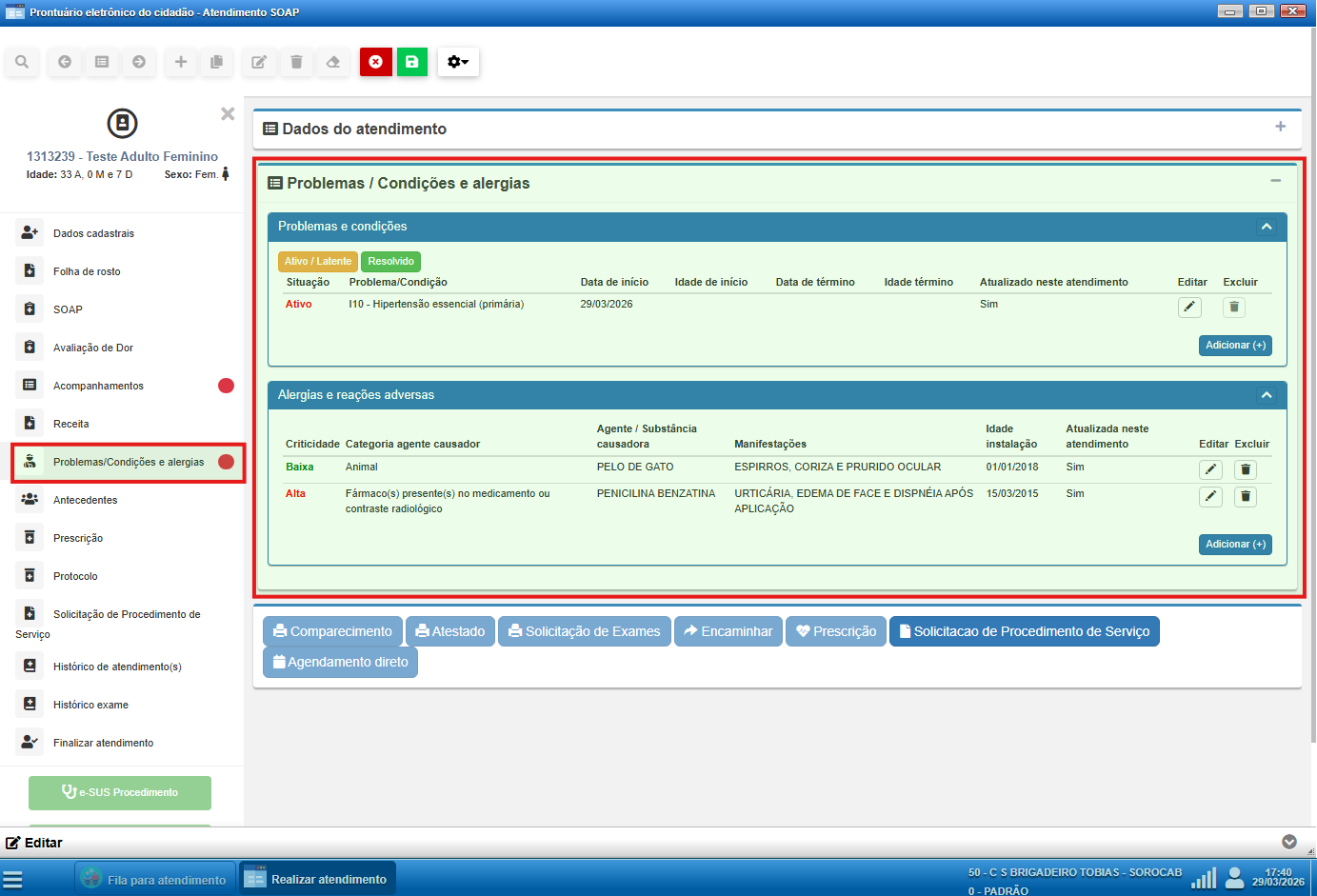 A opção Problemas, Condições e Alergias permite registrar e consultar informações clínicas importantes do paciente, que devem ser consideradas durante o atendimento.