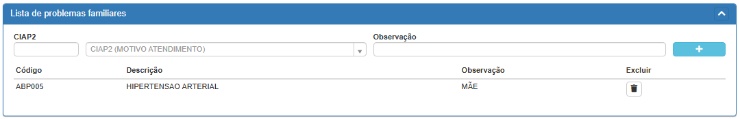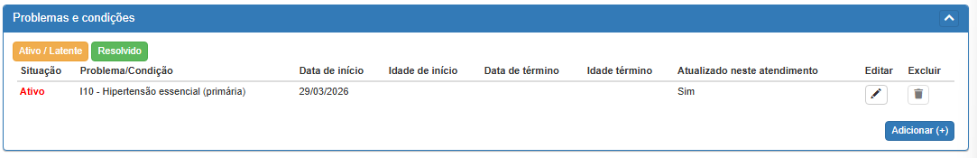 - O botão Adicionar (+) permite incluir um novo problema ou condição no histórico do paciente.