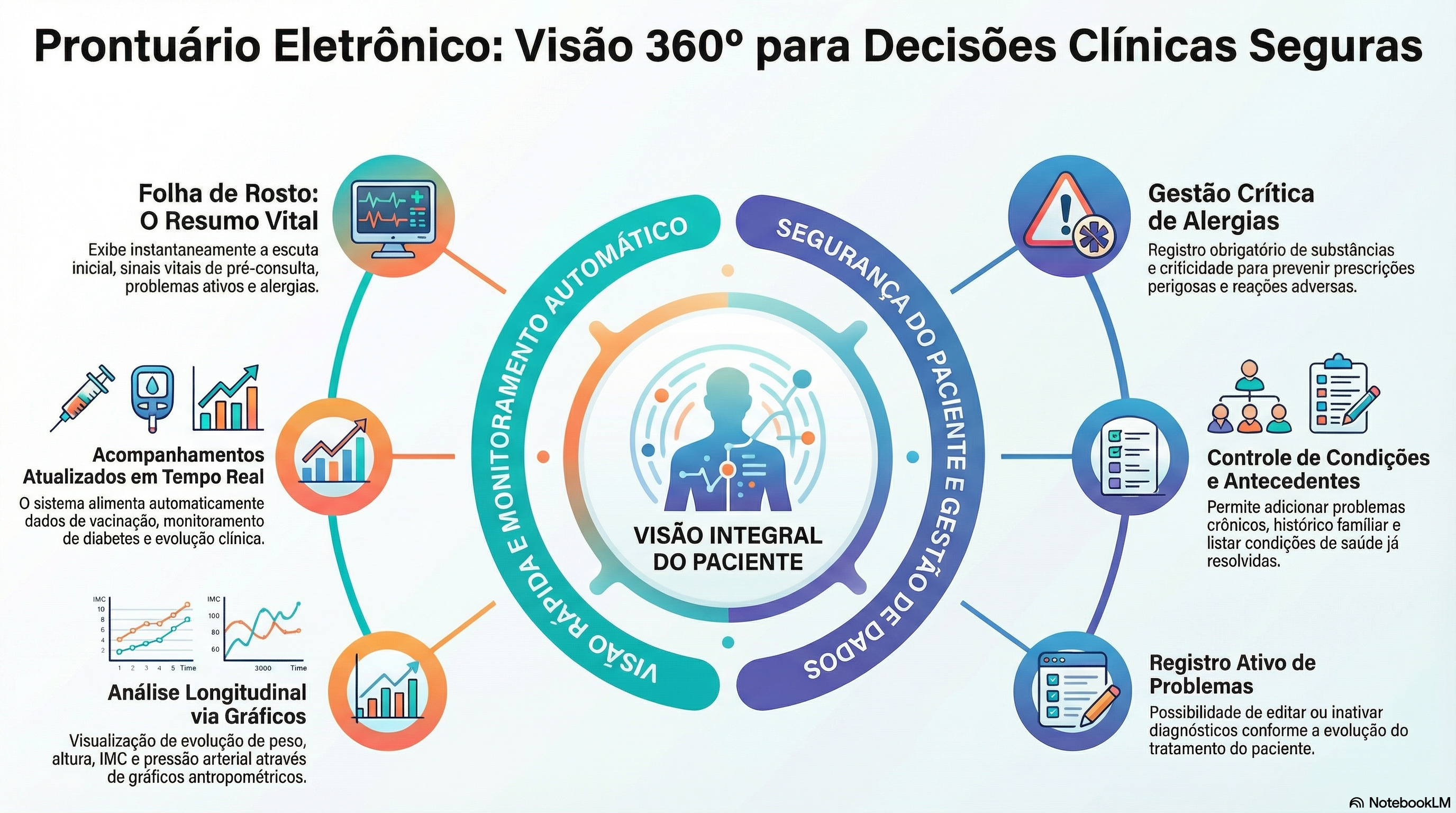 Neste contexto, o sistema disponibiliza um conjunto de informações consolidadas que permitem visualizar o histórico clínico do paciente de forma organizada. Entre essas informações, destacam-se a folha de rosto, os acompanhamentos em andamento, os problemas, condições e alergias registrados, além dos antecedentes clínicos.