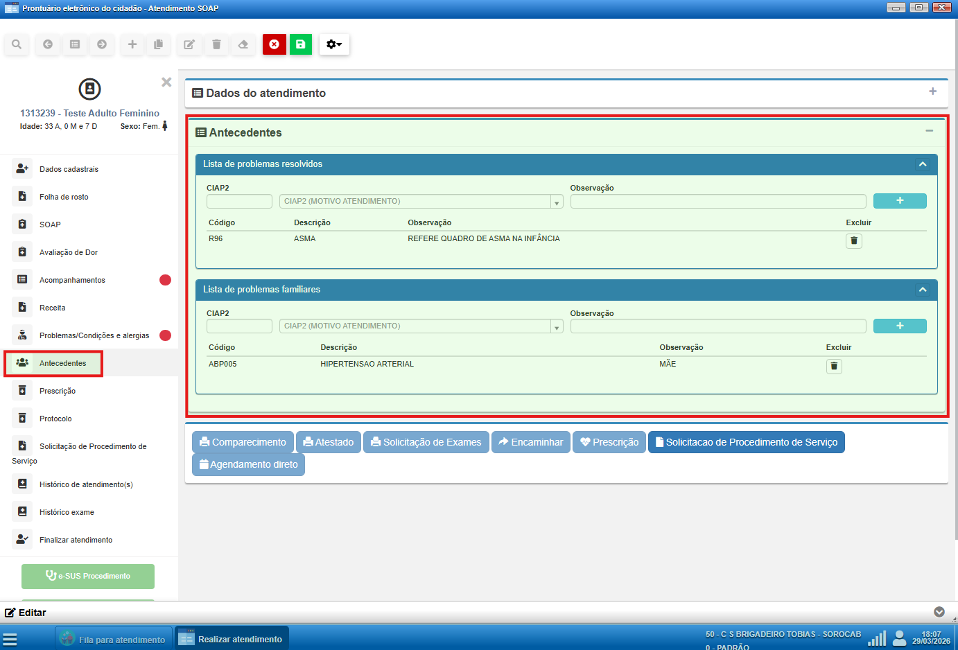 A opção Antecedentes permite registrar informações relevantes sobre o histórico do paciente, incluindo problemas já resolvidos e condições familiares.