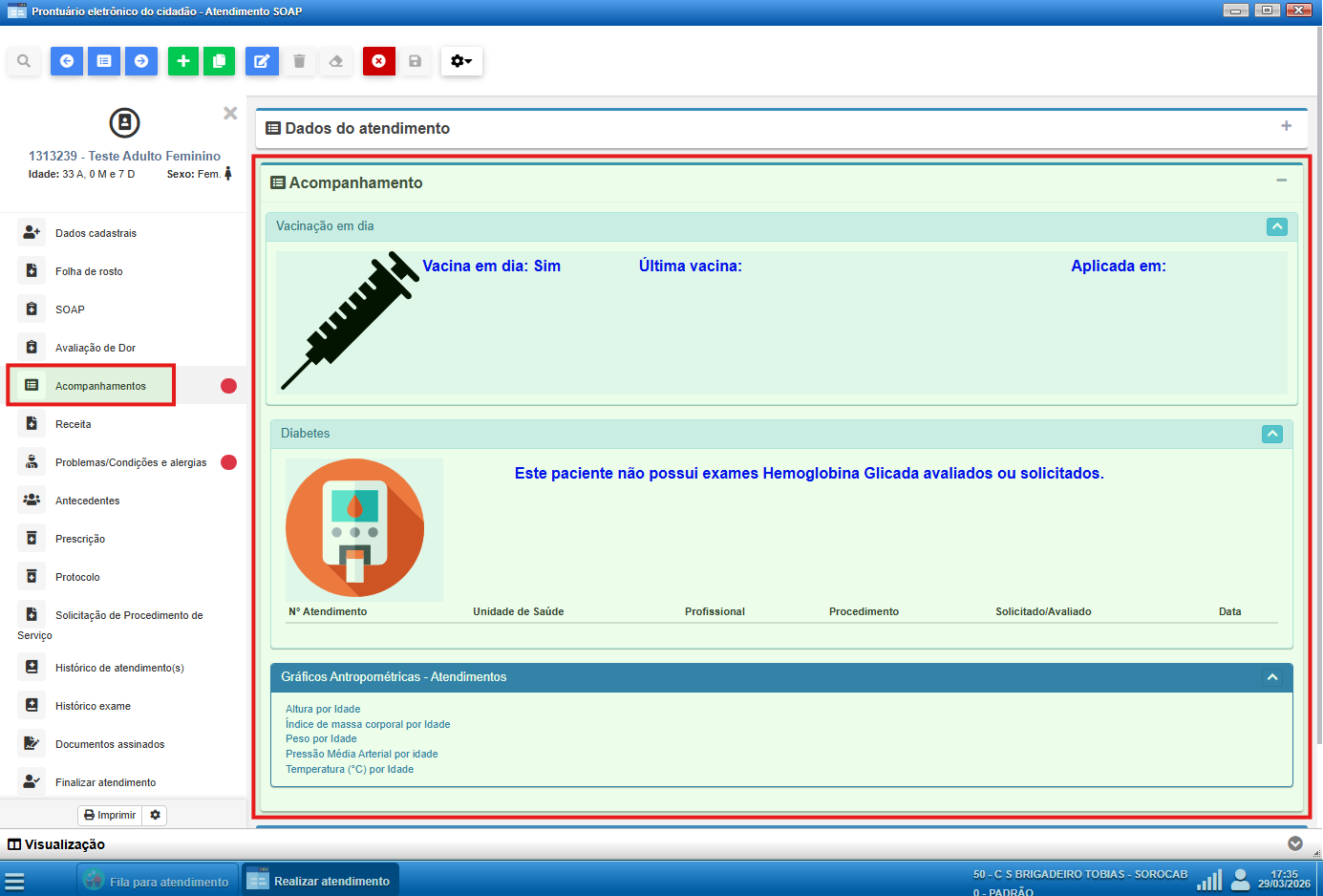 Durante o registro de atendimento no sistema, é fundamental que o profissional tenha acesso rápido às principais informações clínicas do paciente. Esses dados auxiliam na tomada de decisão, promovem maior segurança no cuidado e garantem a continuidade do acompanhamento ao longo do tempo.