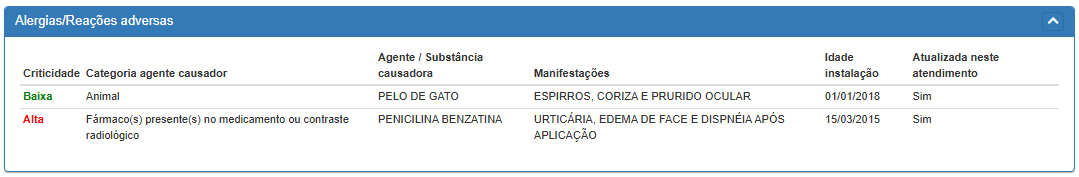 O bloco Alergias/Reações adversas apresenta as informações registradas sobre alergias e reações do paciente a substâncias, medicamentos ou outros agentes.