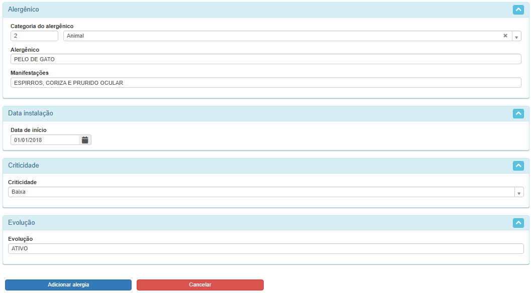 Ao clicar em Adicionar (+) ou Editar, será aberta a tela de preenchimento da alergia, com os campos necessários para registro.