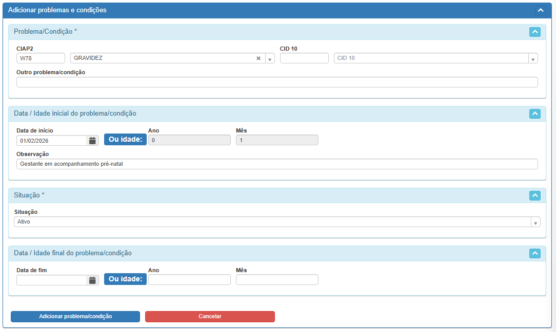 No bloco Problemas e condições, é possível tanto editar registros já existentes quanto adicionar novos problemas ou condições ao histórico do paciente.