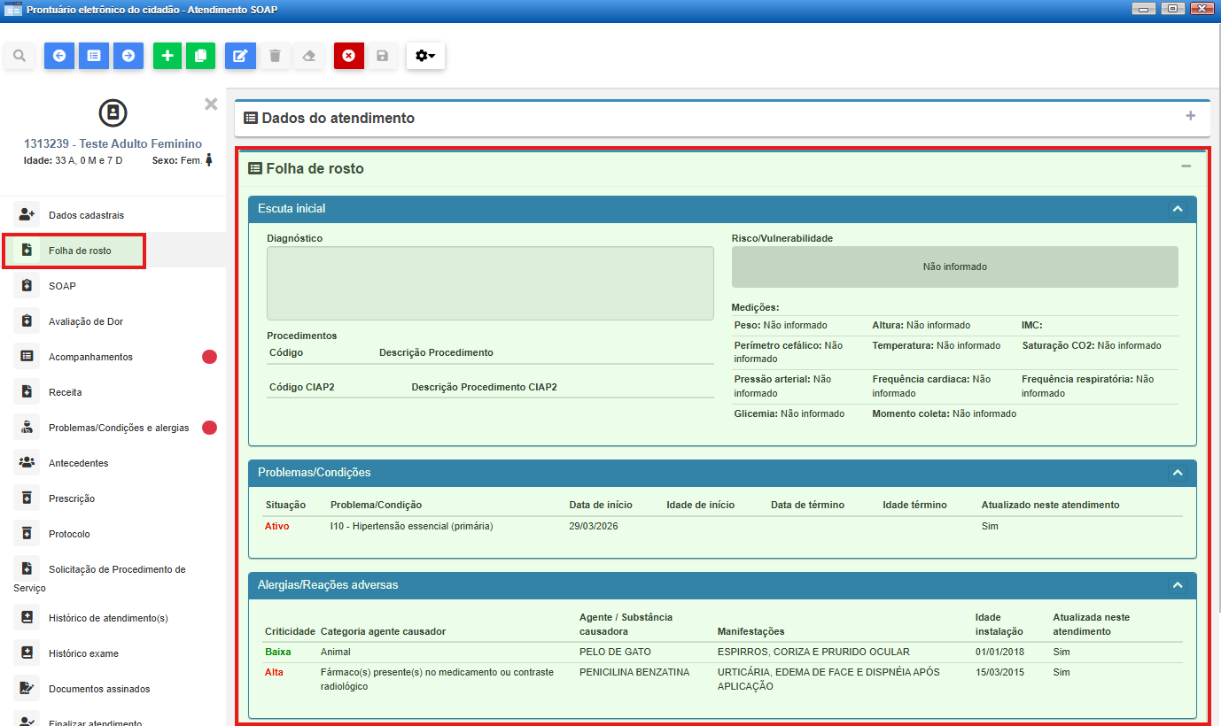 A folha de rosto do paciente apresenta um resumo das principais informações clínicas registradas no sistema. Essa visualização permite que o profissional tenha uma visão rápida do histórico de saúde do paciente, auxiliando na tomada de decisão durante o atendimento.