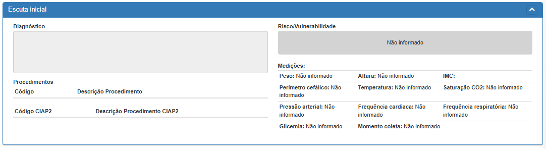 O bloco Escuta inicial apresenta as informações registradas durante a pré-consulta do paciente, como nos atendimentos de acolhimento ou classificação de risco.