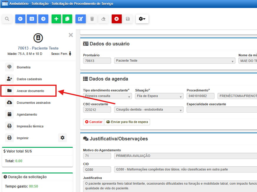 Nesse momento, é importante que se atente a necessidade de encaminhar algum documento em anexo junto a solicitação. Por exemplo, se o encaminhamento é feito baseado em uma transcrição de guia, você pode digitaliza-lo e anexar ao pedido no botão Anexar Documento, no menu lateral.
