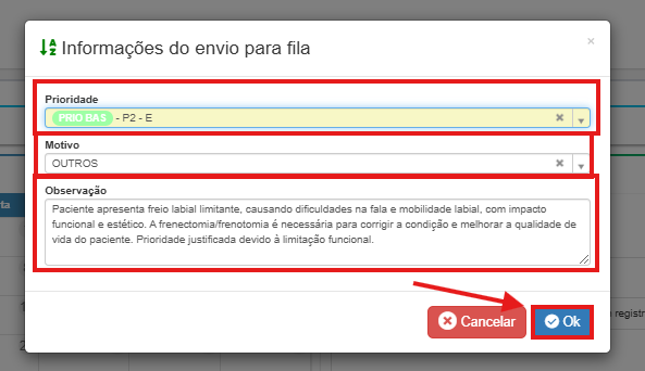 IMPORTANTE: Os dados preenchidos no campo "Observação" servem como resumo na tela do médico regulador. Esse é o primeiro dado que ele visualizará para tomar decisões sobre o encaminhamento do paciente.