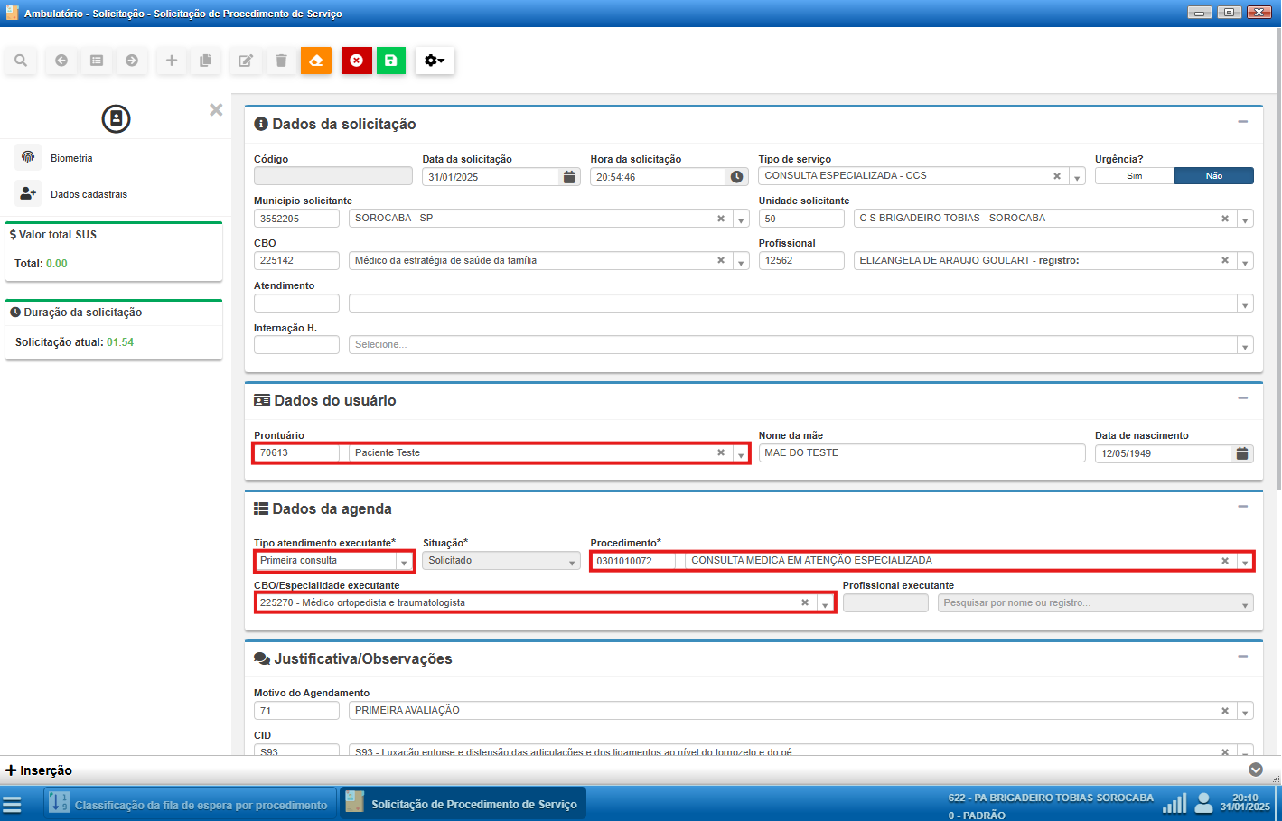 | CONSULTA ESPECIALIZADA | 9999999988 | PEQUENA CIRURGIA CENTRO CIRURGICO | 225225 | Médico cirurgião geral | Registra |
