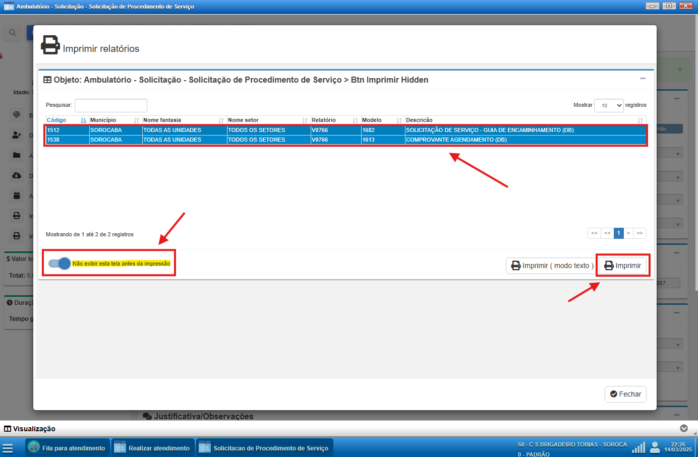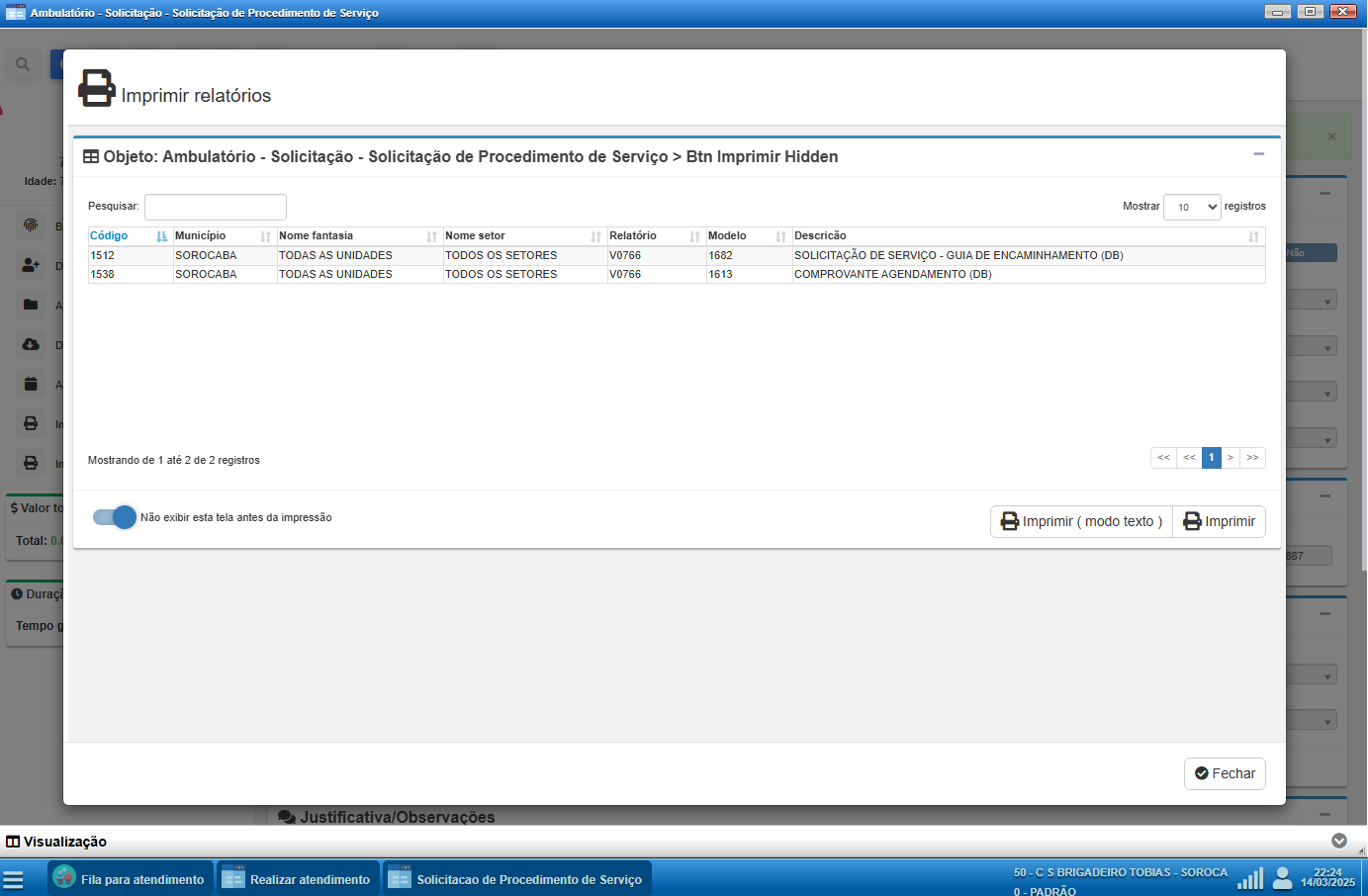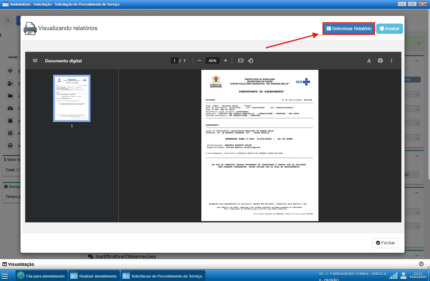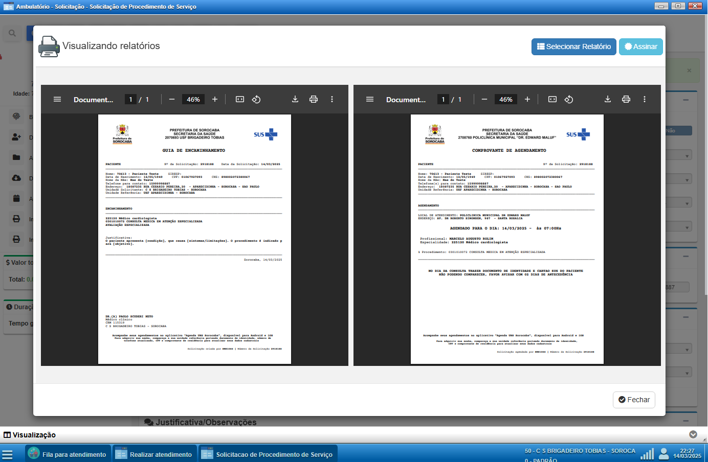 O sistema permite a geração e impressão de relatórios personalizados diretamente nas telas onde há a opção de impressão. Na tela de Solicitação de Procedimento de Serviço, é possível gerar dois documentos principais: a Guia de Encaminhamento e o Comprovante de Agendamento.