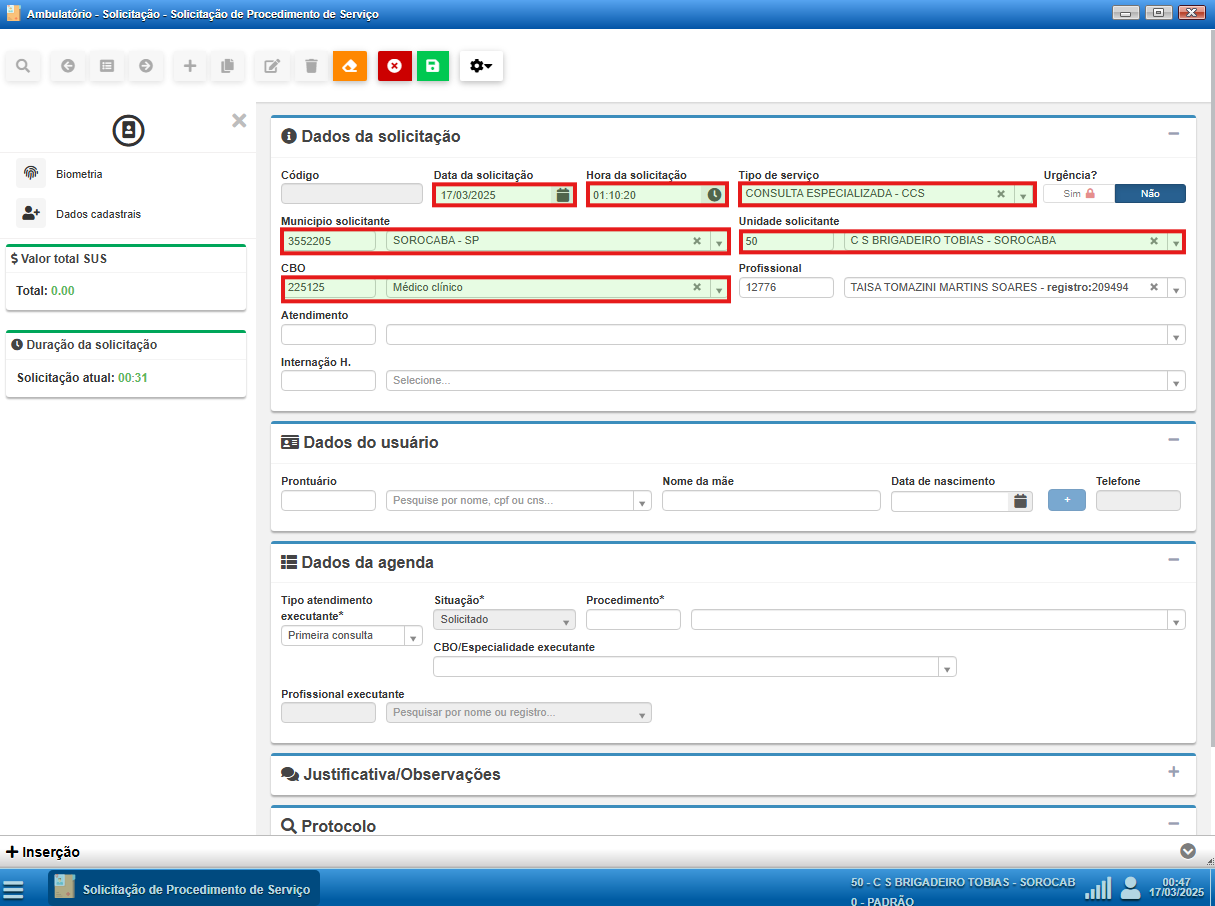 - CBO do profissional solicitante