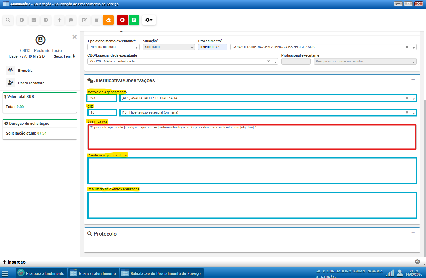 Na versão v25.02.13 e anteriores, apenas o campo de justificativa é obrigatório no sistema. No entanto, recomenda-se preencher também, pelo menos, o campo de motivo do agendamento e o CID. Esse preenchimento completo contribui para maior agilidade no processo, evitando que a solicitação seja devolvida com pendências pela equipe da Central de Regulação, o que pode atrasar o atendimento ao paciente. Para melhorar esse fluxo, será aberto um chamado solicitando a customização deste módulo no sistema, tornando esses campos obrigatórios.