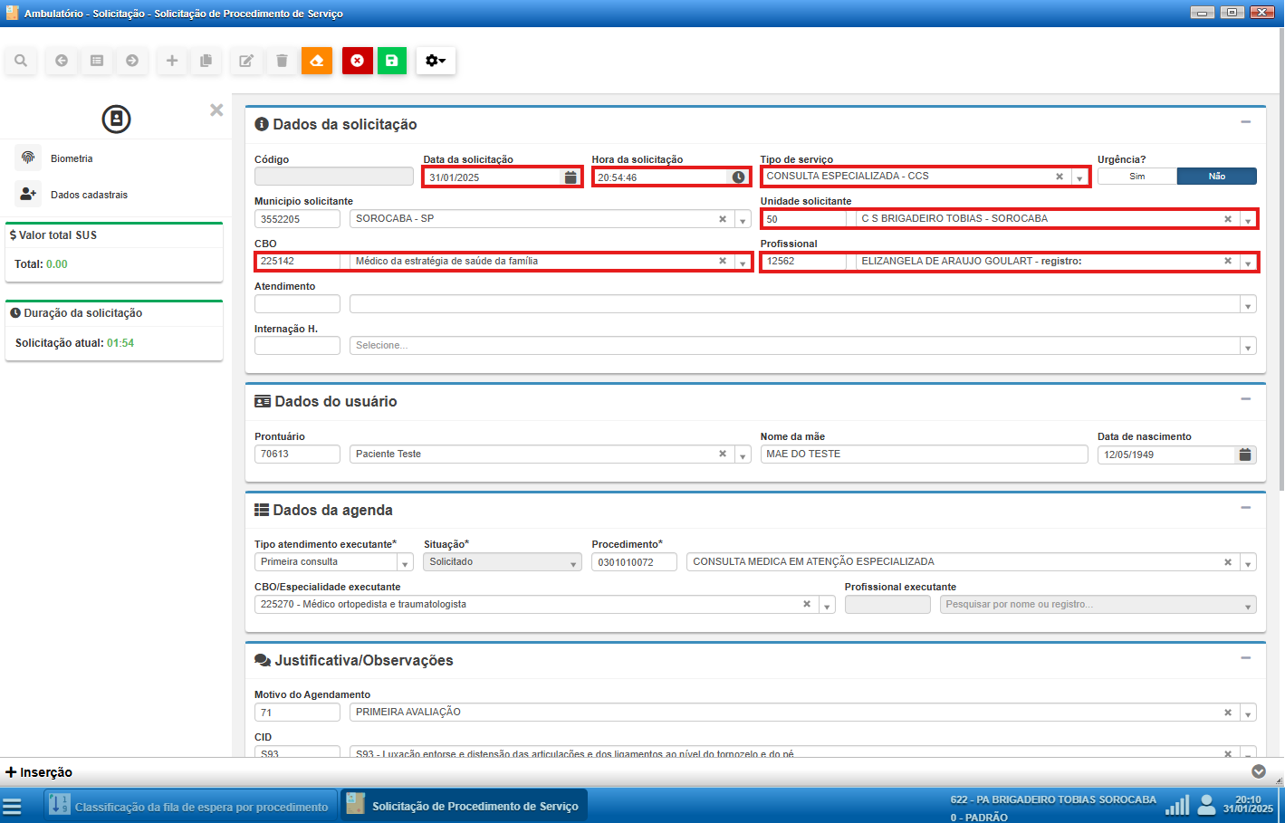 O Acesso para inserção deverá ser feito na tela Solicitação de Procedimento de Serviço, que deve ser encontrada em Ambulatório > Solicitação > Solicitação de Procedimento de Serviço.