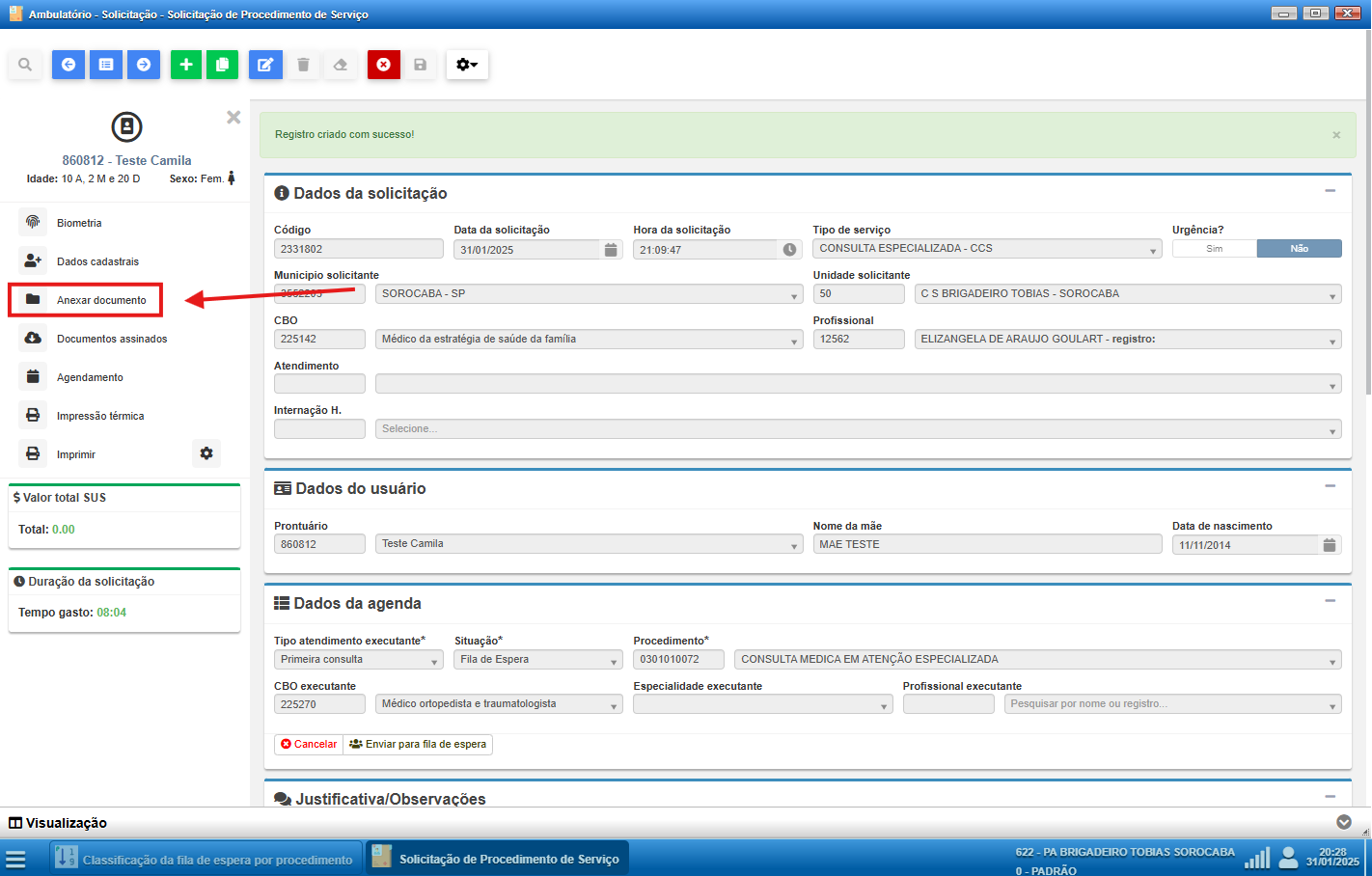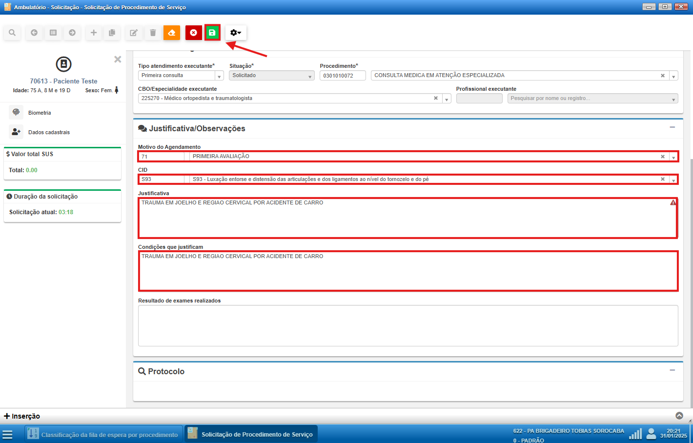A confirmação de envio da solicitação para a fila deverá aparecer desde que todos os dados estejam corretamente digitados.