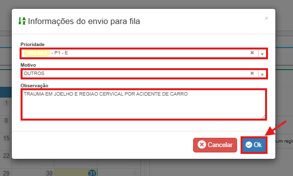 Agora, preencha as informações do envio para a fila conforme os dados presentes na guia física.