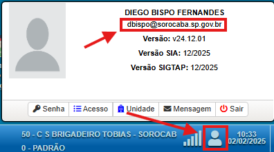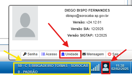 | Unidade e setor onde estou trabalhando: Na barra de tarefas do sistema, no canto inferior direito, há um visualizador fácil para identificar em qual unidade/setor você está logado. |