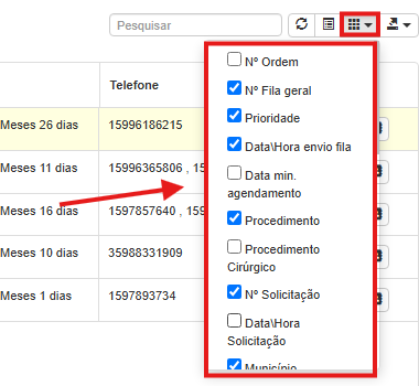 Parametrização de visualização de tabelas: Essas tabelas geralmente também permitem a possibilidade de configurar o layout de apresentação, basta clicar no botão e selecionar quais informações você quer deixar para serem visualizadas em tela. |