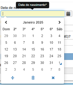 Data: digite a data ou clique no símbolo no canto direito do campo, onde aparecerá o calendário, com a data atual selecionada. Para avançar/retroceder o mês: clicar nas setas |