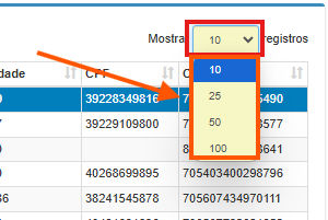 | Quantidade de resultados na busca: Algumas informações do sistema serão demonstrados em tabela, com o padrão de mostrar 10 registros, nesse caso, há opção de aumentar a quantidade de registros que deseja visualizar. | |