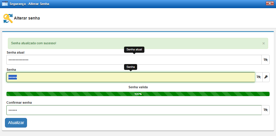 A tela que abrirá quando clicar em Senha pedirá que você informe a senha atual e, após, pedirá que digite uma nova senha e, por questão de segurança, repita a mesma nova senha no campo abaixo, bastando apenas clicar em Atualizar para concluir a tarefa.