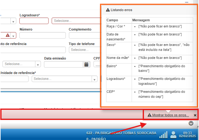| Barra de erros: O Sistema é preparado para apresentar no rodapé da página uma barra que descreve os erros ao realizar algum procedimento, bastando parar o mouse sobre "Mostrar todos os erros" para saber o que resolver. | |