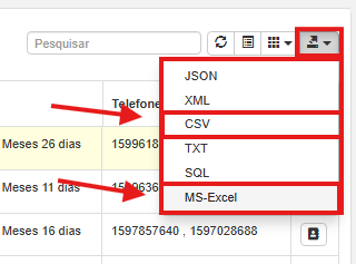 Exportação de resultados em tabela: Algumas telas do sistema que retornam os dados em tabela, apresentam no canto superior direito do bloco o botão que permite extrair a tabela em diversos formatos, incluindo MS Excel ou .csv |
