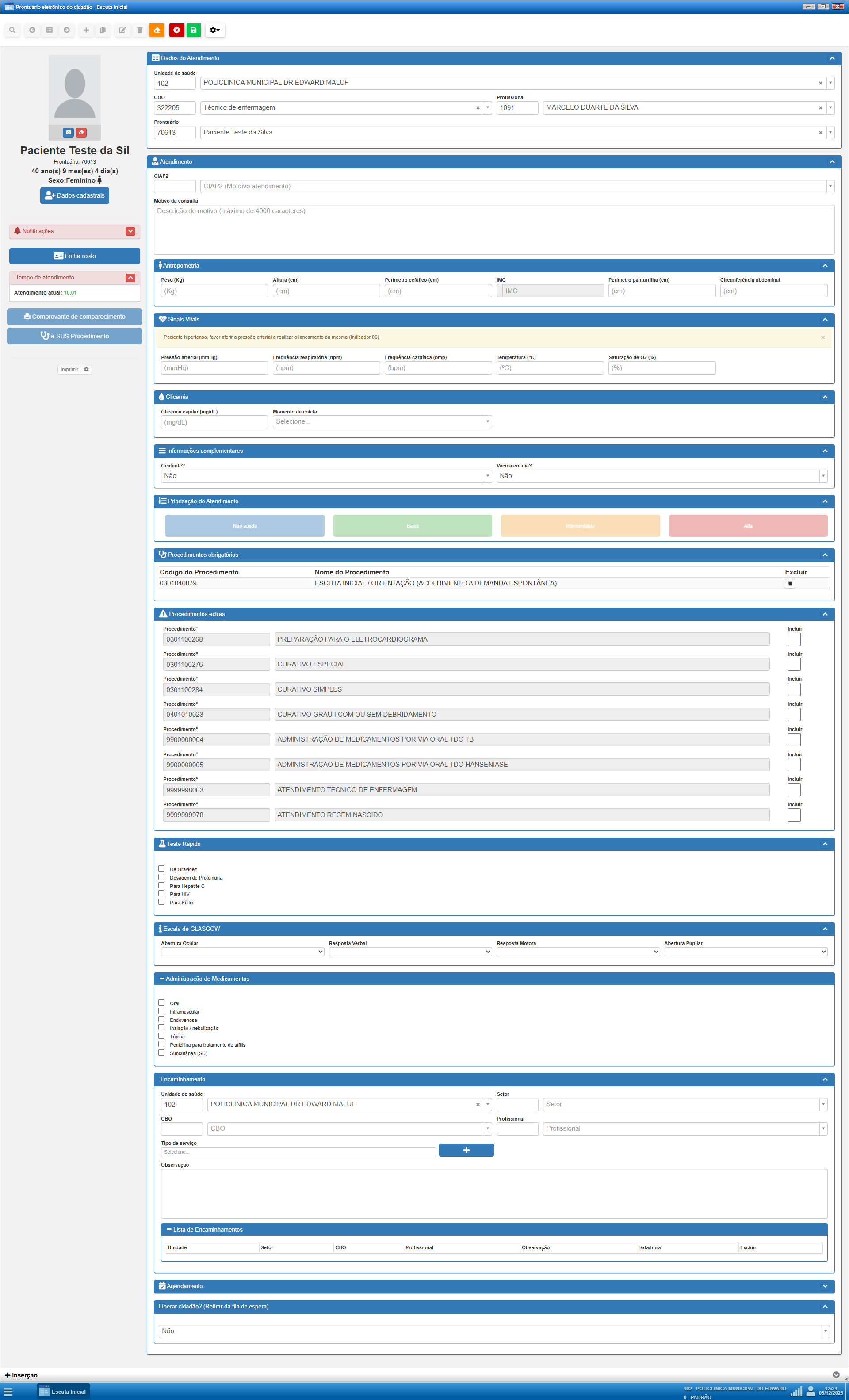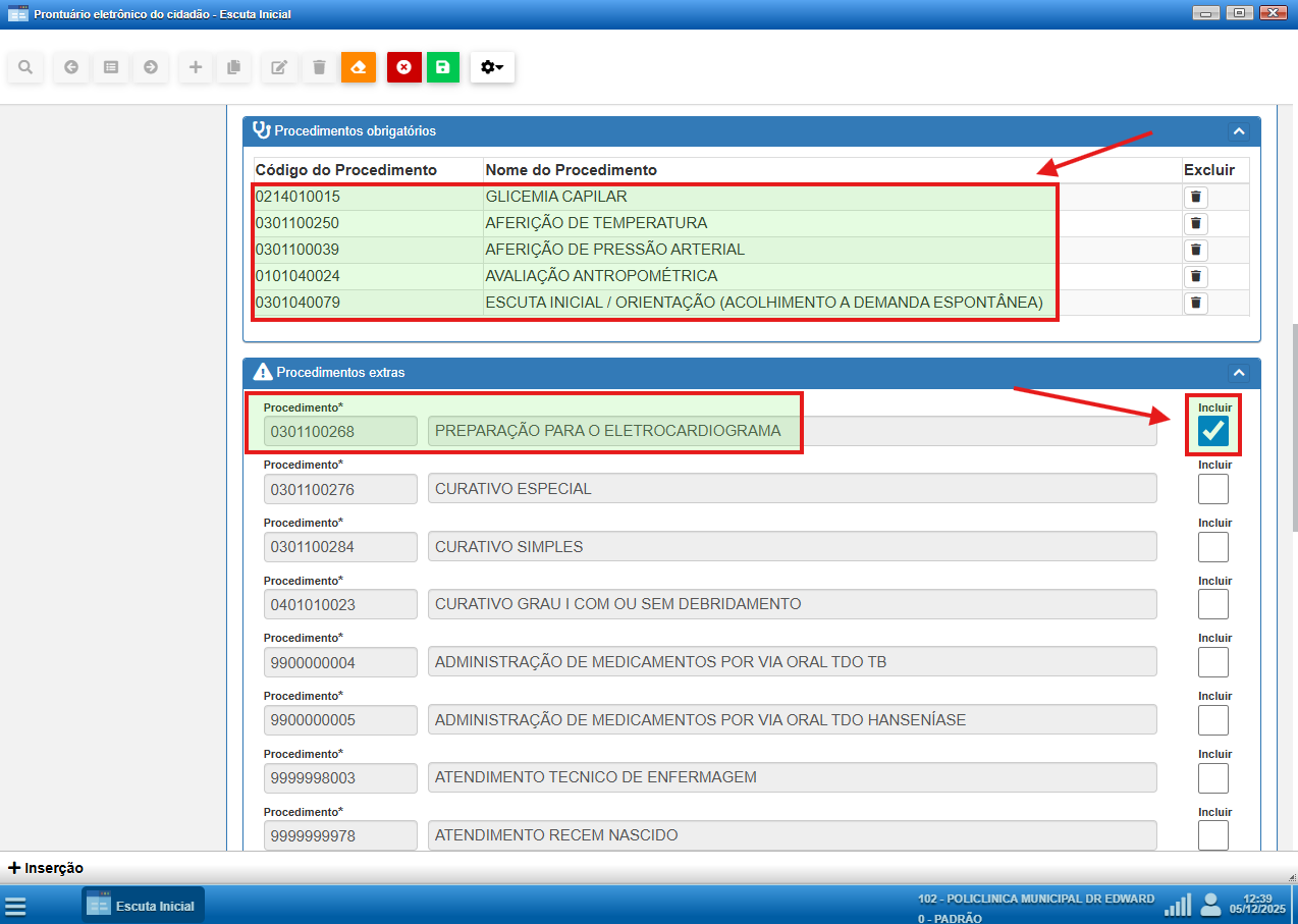Note que ao preencher os campos estruturados de antropometria, sinais vitais e exames, o sistema colocará alguns procedimentos automáticamente em Procedimentos Obrigatórios, porém, também será necessário registrar o procedimento executado pela enfermagem: