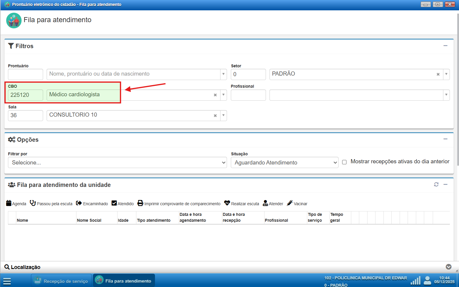 Quando o paciente comparecer à unidade, abra a Escuta Inicial a partir da fila do cardiologista, para isso, altere o filtro do profissional da fila ou especialidade na fila.