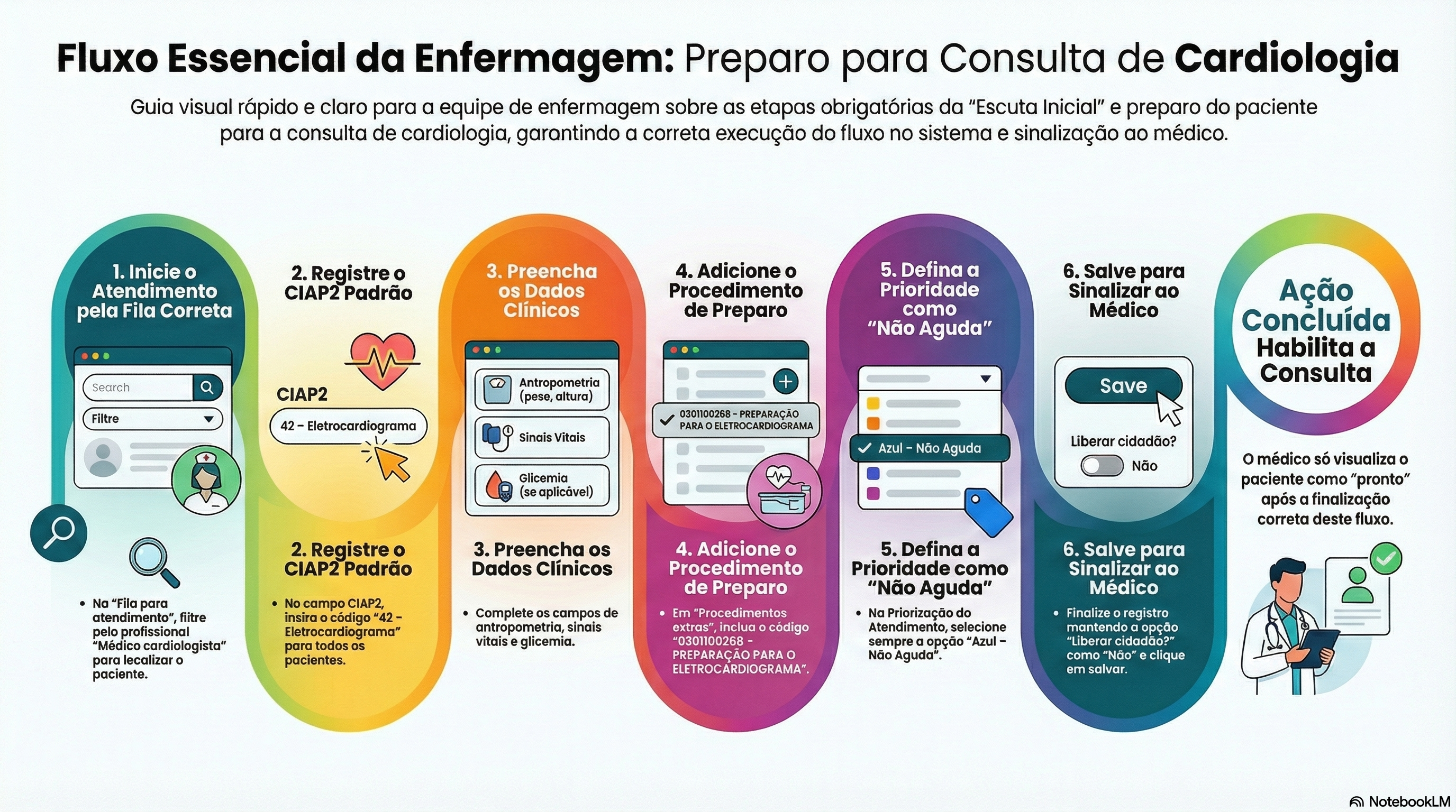 A etapa da Enfermagem é essencial para garantir a correta execução do fluxo OCI Cardiologia. É durante a Escuta Inicial que são registrados sinais vitais, CIAP2, antropometria, glicemia (quando aplicável) e o procedimento preparatório para o ECG, além de permitir que o sistema sinalize ao médico que o paciente está pronto para ser chamado.