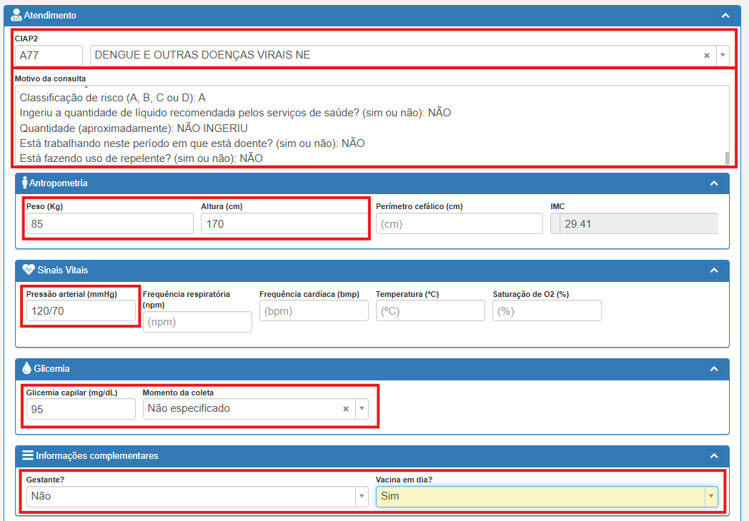 Copiando o pré-registro sugerido acima, você deve prosseguir com os preenchimentos antropométricos e demais informações do paciente, de acordo com o que se estabelece nos protocolos de Dengue.