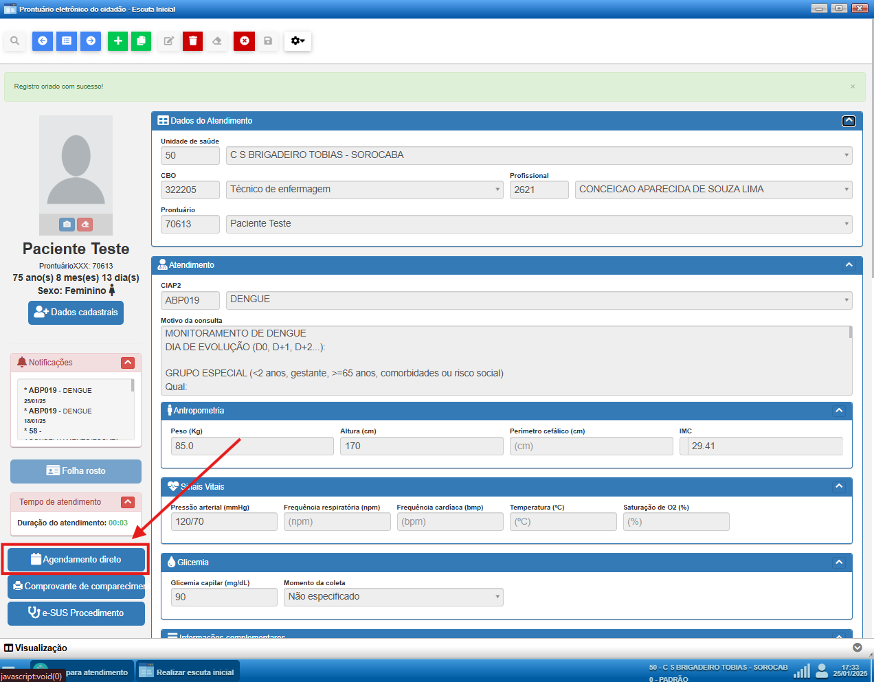Após finalizar o atendimento, você deverá certificar-se de realizar agendamento de monitoramento de dengue, essa ação pode ser feita diretamente na tela da escuta inicial, clicando no botão "Agendamento direto"