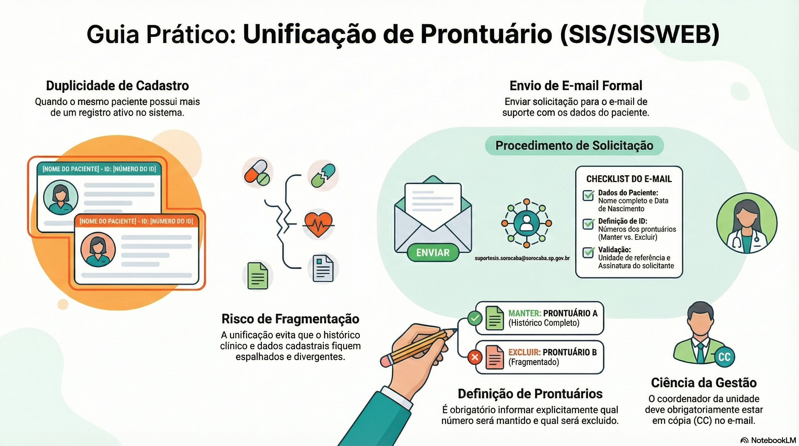 Para solicitar a unificação de prontuário, o operador da unidade deve encaminhar e-mail ao suporte do SIS <suportesis.sorocaba@sorocaba.sp.gov.br> contendo as informações necessárias para análise.