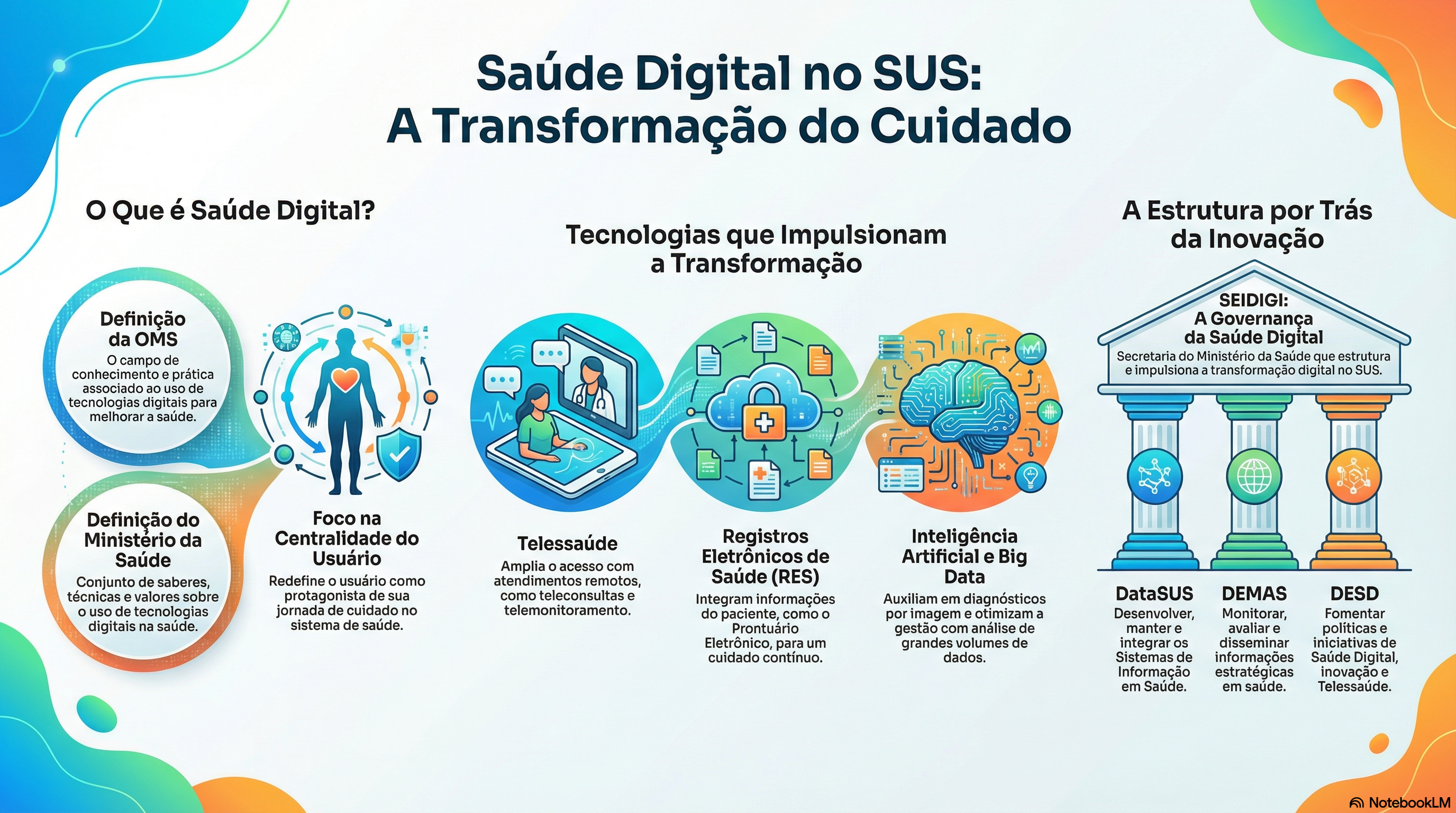O avanço das tecnologias digitais tem transformado significativamente a forma como a saúde é concebida, ofertada e gerida em diferentes contextos. No Sistema Único de Saúde (SUS), essa transformação se materializa por meio da Saúde Digital — um conceito que vai além da simples adoção de tecnologias, envolvendo práticas, valores e modos de pensar o cuidado em saúde.