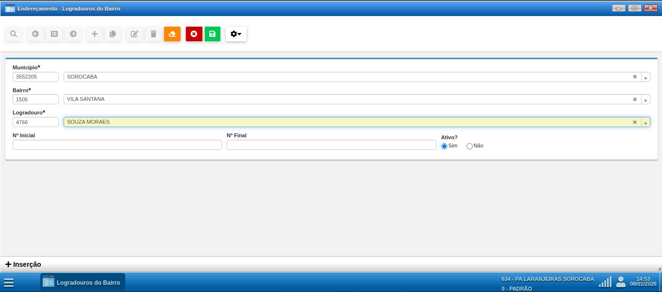 Nesta tela, o sistema faz o vínculo entre o logradouro e o bairro.
