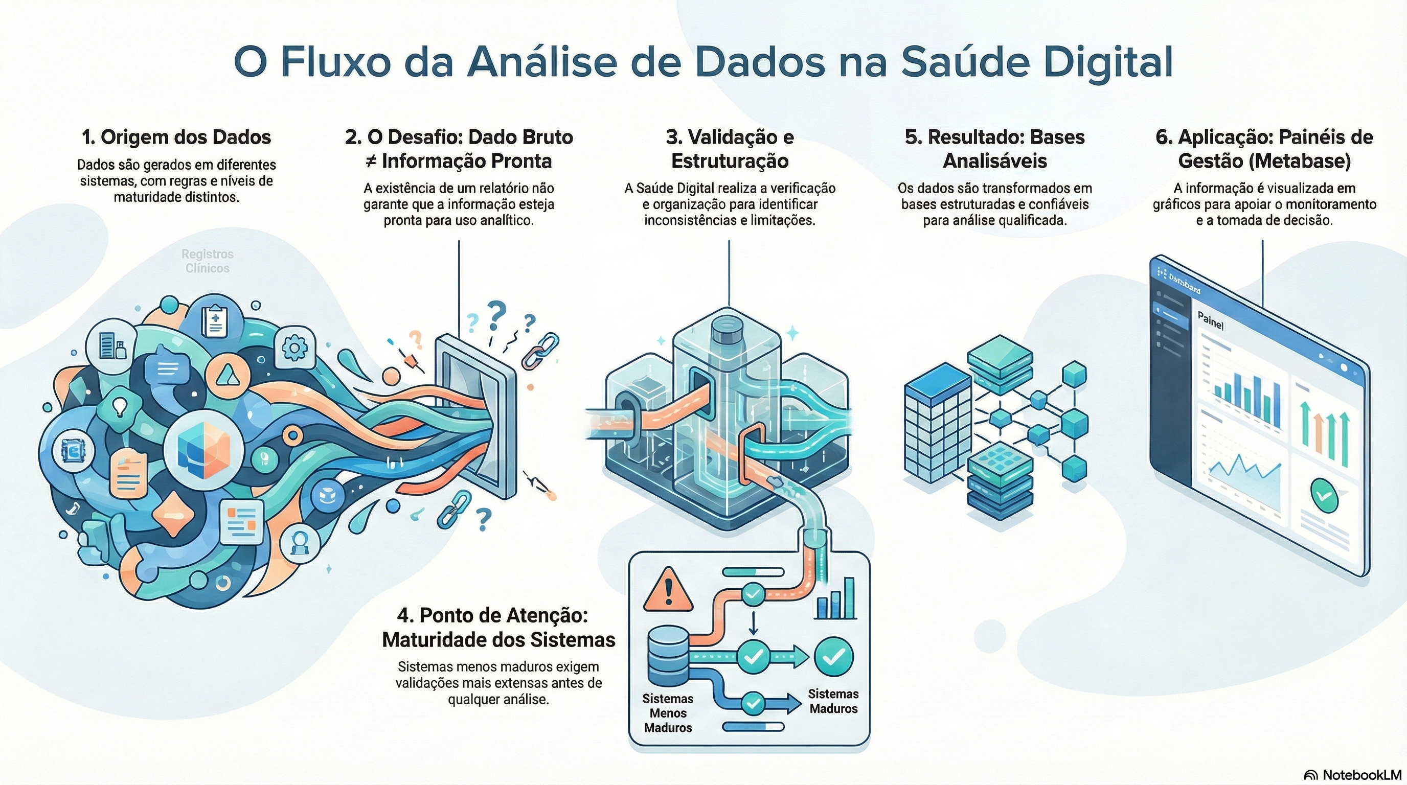Os dados em saúde são produzidos em diferentes sistemas, com estruturas, regras e níveis de maturidade distintos. Por esse motivo, a simples existência de relatórios não garante, por si só, que a informação esteja pronta para uso analítico. Antes de serem utilizados em painéis e gráficos, os dados passam por etapas de verificação, organização e validação, buscando identificar inconsistências, limitações e possíveis impactos na interpretação dos resultados.