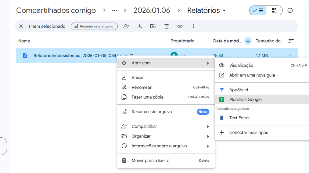 Clique com o botão direito e selecione Abrir com > Planilhas Google.