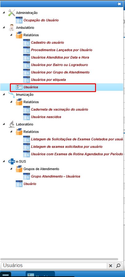 Caso o erro glosado seja cadastral, como por exemplo Telefone inválido, pesquise por "Usuários" e escolha o que está dentro da sessão "Ambulatório"