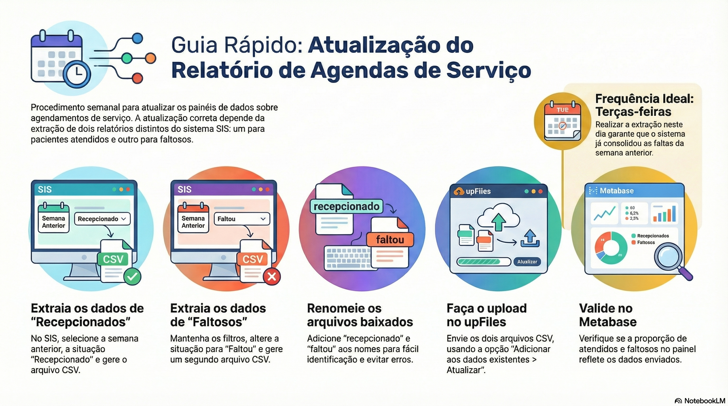Após o upload no upFiles, a validação consiste em verificar se os valores apresentados no Metabase estão coerentes com a quantidade aproximada de registros observada durante o upload, especialmente por meio do gráfico que apresenta a proporção entre atendidos e faltosos. O painel considera exclusivamente esses dois tipos de agendamento, não contemplando análises de vagas abertas ou outros estados. |