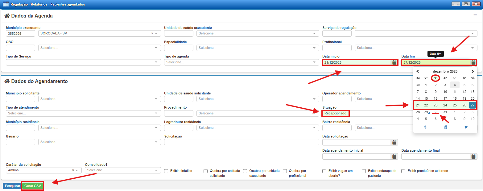 Ao acessar a tela de Relatório de Pacientes Agendados, selecione o período correspondente à semana anterior, preferencialmente utilizando o calendário do sistema para marcar o primeiro dia da semana (domingo) até o último dia (sábado). Em seguida, no campo Situação, selecione a opção Recepcionado e clique em Gerar CSV para realizar o download dos dados.